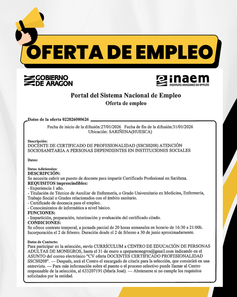 CURSO 25-26 OFERTA DE EMPLEO Publicado por cpepamonegros en 26 enero, 2026 Leer la siguiente → CURSO 25-26 I Feria de la salud Monegros Centro CURSO 25-26 PRUEBA DE N2 EN FEBRERO CURSO 25-26 MATRÍCULA 2º CUATRIMESTRE DE ESPAD cpepamonegros Leer la siguiente → CURSO 25-26 I Feria de la salud Monegros Centro CURSO 25-26 PRUEBA DE N2 EN FEBRERO CURSO 25-26 MATRÍCULA 2º CUATRIMESTRE DE ESPAD